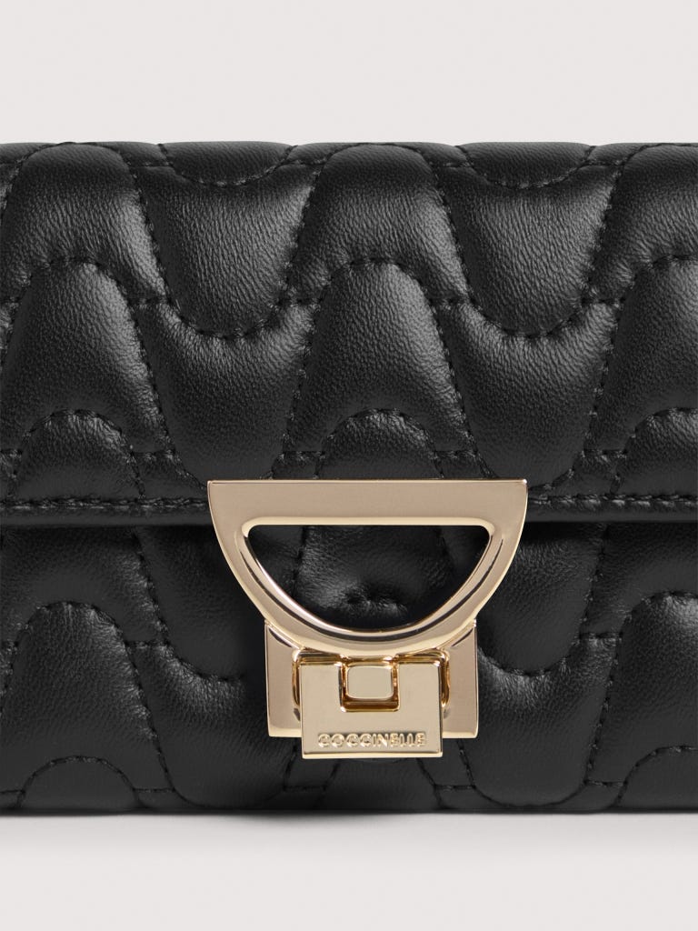 Diese Geldbörse mit Überschlag ist mit dem ikonischen Arlettis-Verschluss verziert. Durch die optimale Aufteilung lässt sich alles Notwendige sorgfältig und ordentlich unterbringen. Dieses Modell ist in Matelassé-Optik gefertigt, die durch das Steppen von Leder mit gepolsterter Rückseite erzielt wird. Das wellenartige Steppmuster knüpft an die Form eines Plektrums an, das als ikonisches Element der Marke Coccinelle gilt.