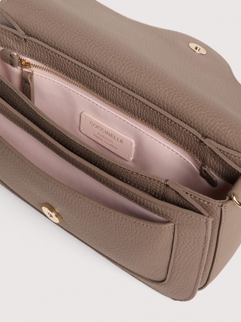 Eine neue Signatur bereichert die Marke: Coccinelle C-Me. Das neu interpretierte Logo, bei dem das C von Coccinelle das ikonische Plektrum der Marke umspielt und sanft umschließt – eine harmonische Einheit, die Vergangenheit und Gegenwart einer Frau auf stilvolle Weise zusammenführt. Die klaren, geometrischen Linien und eleganten Kurven unterstreichen das Design, während das kunstvolle Faltenbalg-Design der Tasche eine perfekte Balance aus Funktionalität und dezenter Eleganz schafft. So wird sie zum unverzichtbaren Alltagsbegleiter der Coccinelle-Frau. Dieses Modell besteht aus Leder, das mit speziellen Maschinen bearbeitetet und anschließend gewalkt wird, damit es sich besonders weich anfühlt. Es ist ein ausgesprochen strapazierfähiges und pflegeleichtes Leder, also ideal für den täglichen Gebrauch.
