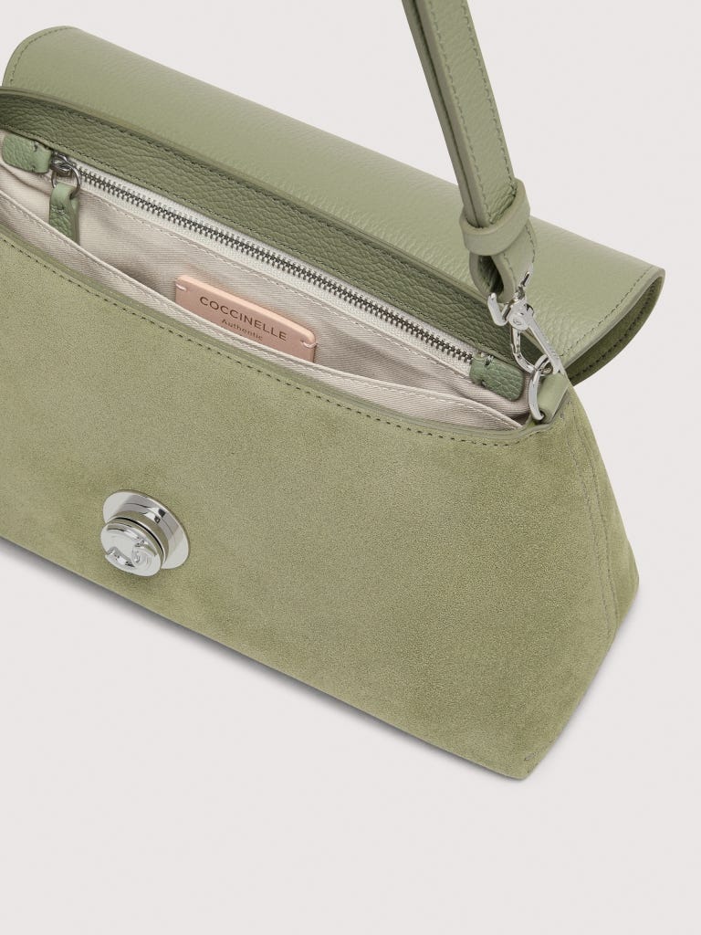 Bei der Linie Coccinelle Nikla wurde das C-Me-Logo in einen edlen Drehverschluss verwandelt, der bei diesem Modell mit Patte elegant zur Geltung kommt. Jede der raffinierten, modernen Taschen kombiniert Details von zeitloser Eleganz mit einer zeitgemäßen Silhouette, die durch die Weichheit des Leders betont wird. Das Modell zeichnet sich durch ein geräumiges Innenfach, eine Tasche auf der Rückseite sowie ein Design mit Doubleface-Leder aus. Dieses Modell ist aus mattem Material gefertigt, das sich weich und samtig anfühlt. Unser Wildleder wird einer Behandlung unterzogen, die den natürlichen Farbabrieb reduziert und so vor Abfärbung schützt. Es handelt sich um ein empfindliches Material. Zur Reinigung wird eine Bürste mit weichen Borsten empfohlen.