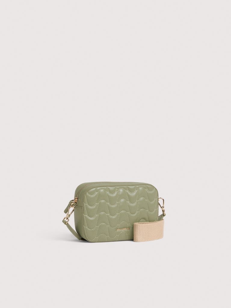 Die aus Leder in raffinierten Farbnuancen und mit Details in Retro-Optik gefertigte Camera Bag Tebe verleiht Alltagsoutfits auch durch den bequemen Schulterriemen aus Stoff einen lässigen Look. Dieses Modell ist in Matelassé-Optik gefertigt, die durch das Steppen von Leder mit gepolsterter Rückseite erzielt wird. Das wellenartige Steppmuster knüpft an die Form eines Plektrums an, das als ikonisches Element der Marke Coccinelle gilt.